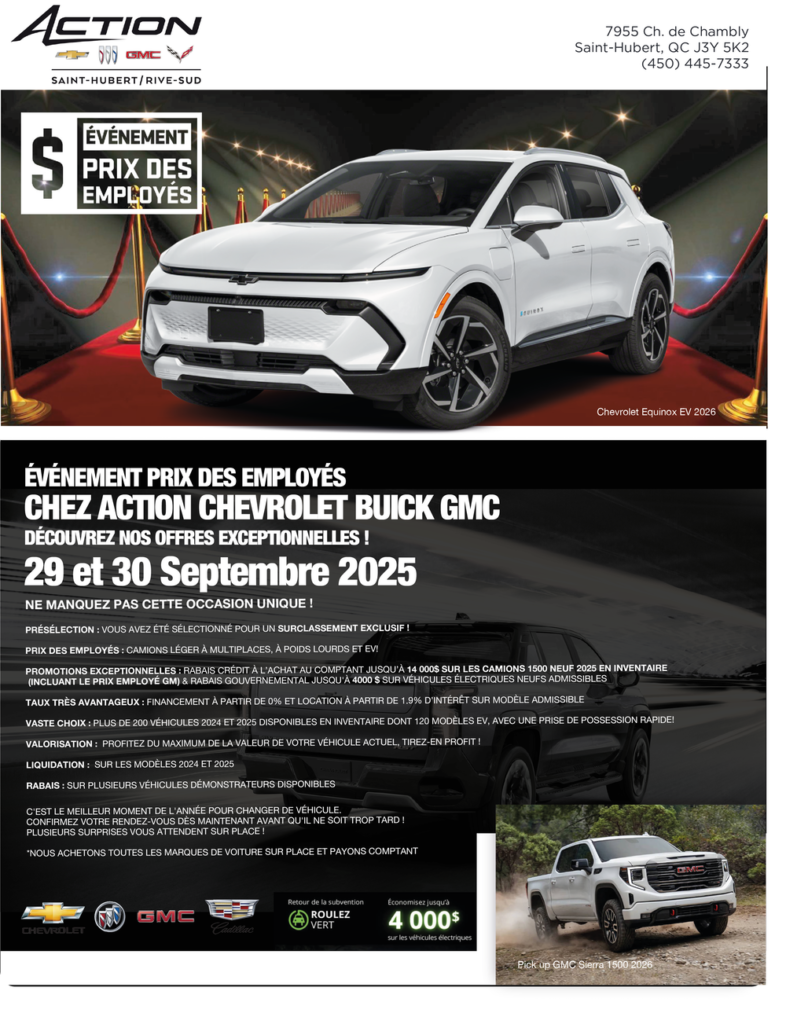 Oui, j’aimerais recevoir des courriels et autres communications électroniques avec des nouvelles, des offres et des mises à jour sur les produits et services Action Chevrolet Buick GMC qui sont pertinents pour moi, selon les renseignements dont vous disposez à mon sujet. Je comprends que je peux retirer mon consentement à tout moment en cliquant sur le lien « me désabonner » dans chaque courriel. Ces renseignements sont recueillis par les commanditaires de ce programme