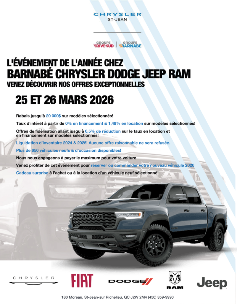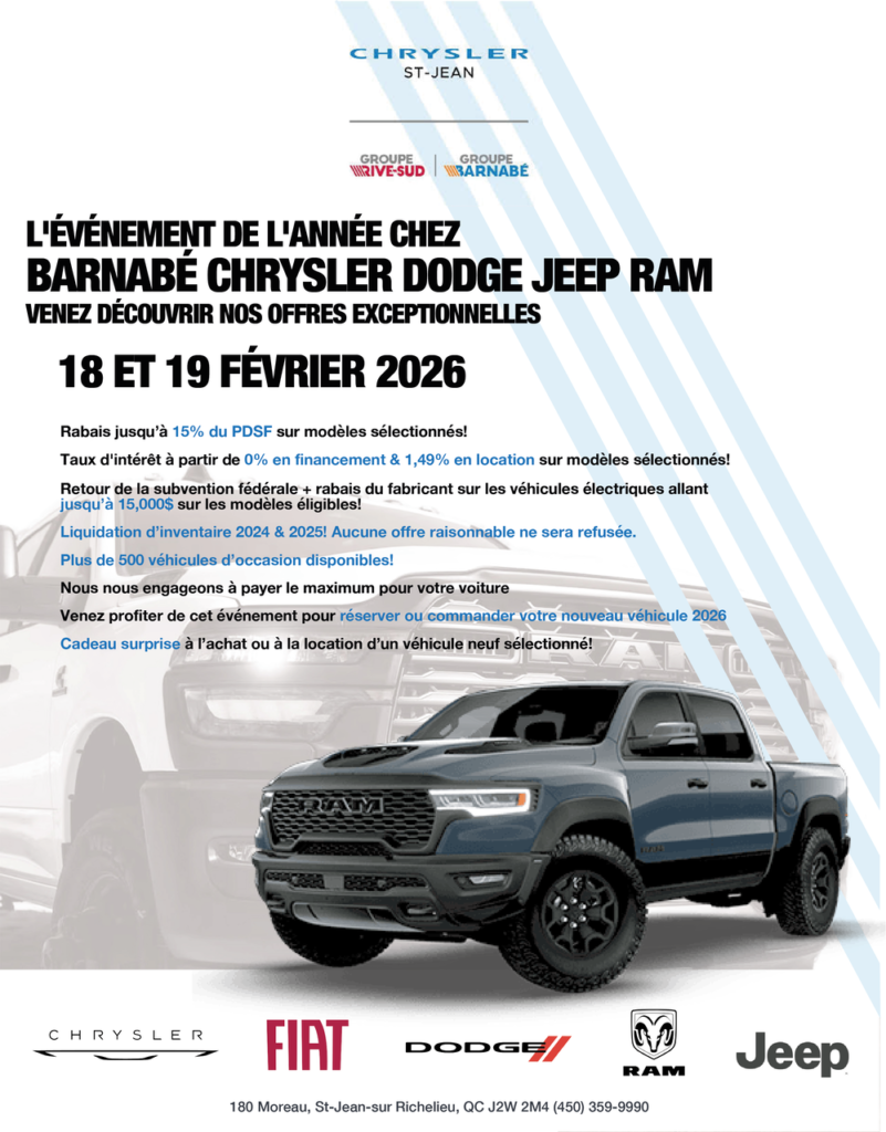 Oui, j’aimerais recevoir des courriels et autres communications électroniques avec des nouvelles, des offres et des mises à jour sur les produits et services Barnabé Chrysler St-Jean qui sont pertinents pour moi, selon les renseignements dont vous disposez à mon sujet. Je comprends que je peux retirer mon consentement à tout moment en cliquant sur le lien « me désabonner » dans chaque courriel. Ces renseignements sont recueillis par les commanditaires de ce programme