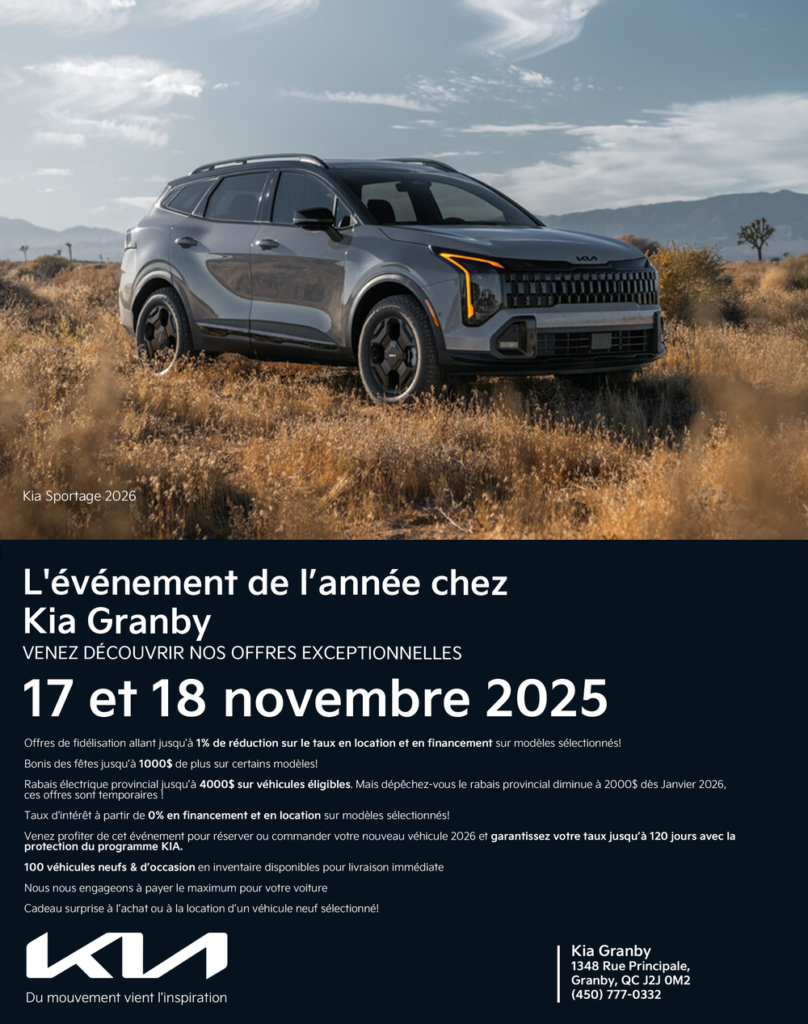 Oui, j’aimerais recevoir des courriels et autres communications électroniques avec des nouvelles, des offres et des mises à jour sur les produits et services Kia Granby qui sont pertinents pour moi, selon les renseignements dont vous disposez à mon sujet. Je comprends que je peux retirer mon consentement à tout moment en cliquant sur le lien « me désabonner » dans chaque courriel. Ces renseignements sont recueillis par les commanditaires de ce programme