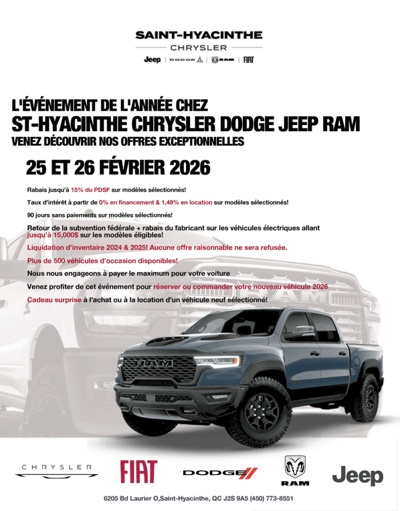 Oui, j’aimerais recevoir des courriels et autres communications électroniques avec des nouvelles, des offres et des mises à jour sur les produits et services St-Hyacinthe Chrysler qui sont pertinents pour moi, selon les renseignements dont vous disposez à mon sujet. Je comprends que je peux retirer mon consentement à tout moment en cliquant sur le lien « me désabonner » dans chaque courriel. Ces renseignements sont recueillis par les commanditaires de ce programme